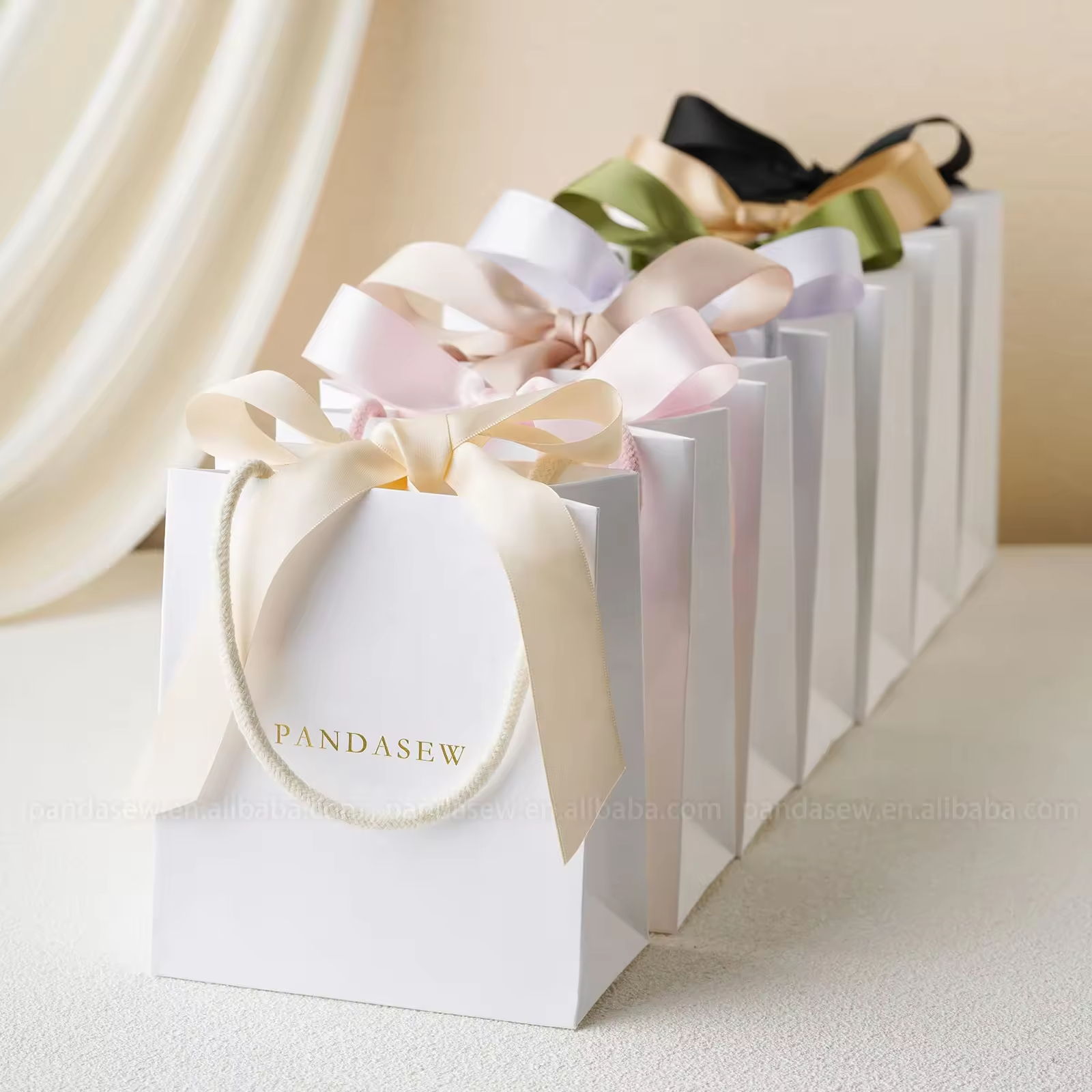 Custom sizes, structures, handle styles (ribbon, rope, cotton), and inserts available. -
